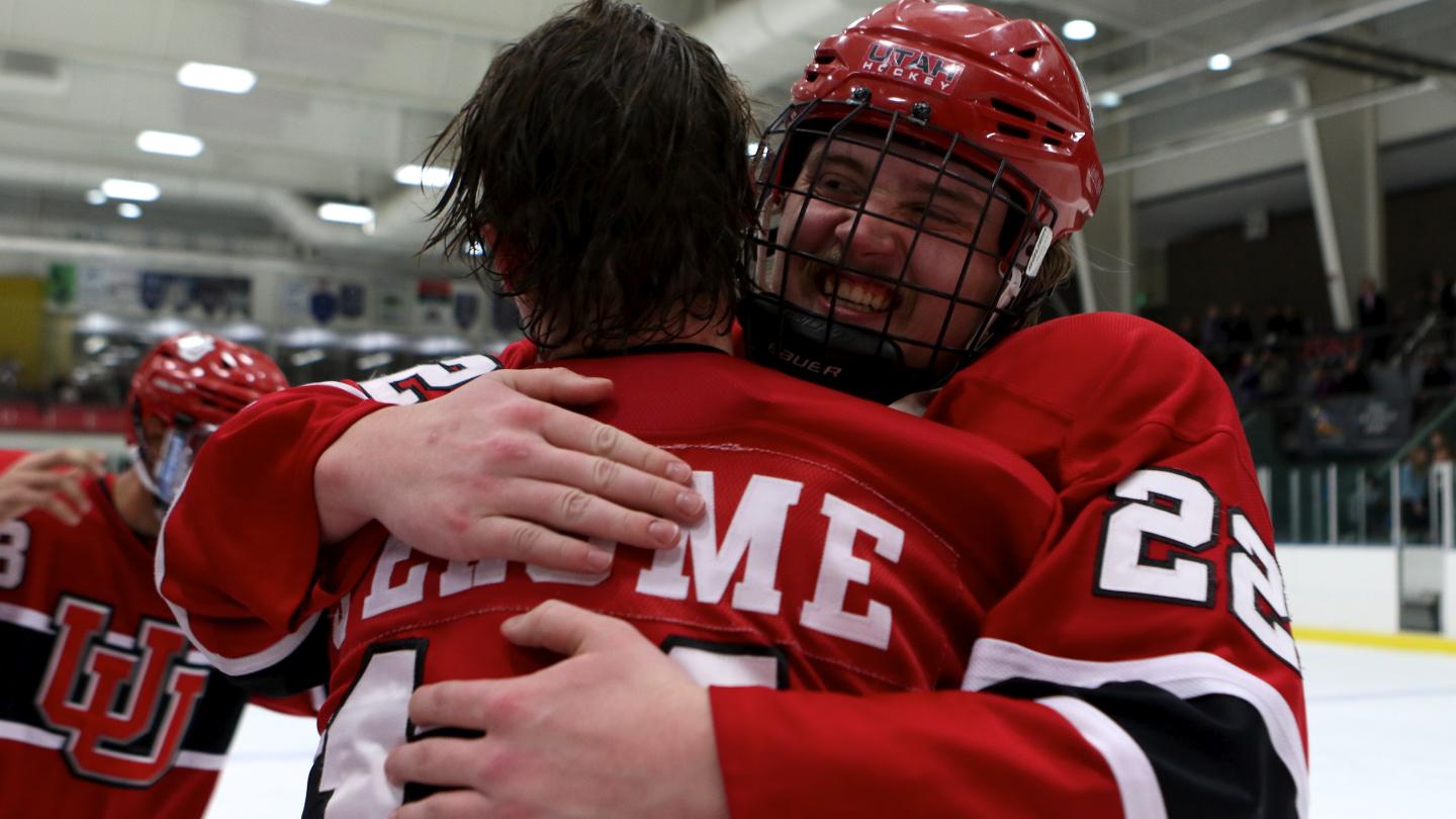 Utah Forward Zach Jerome and Defenseman CJ Odlin celebrate the Wasatch Cup Championship victory after the game versus Weber State on February 1, 2020.