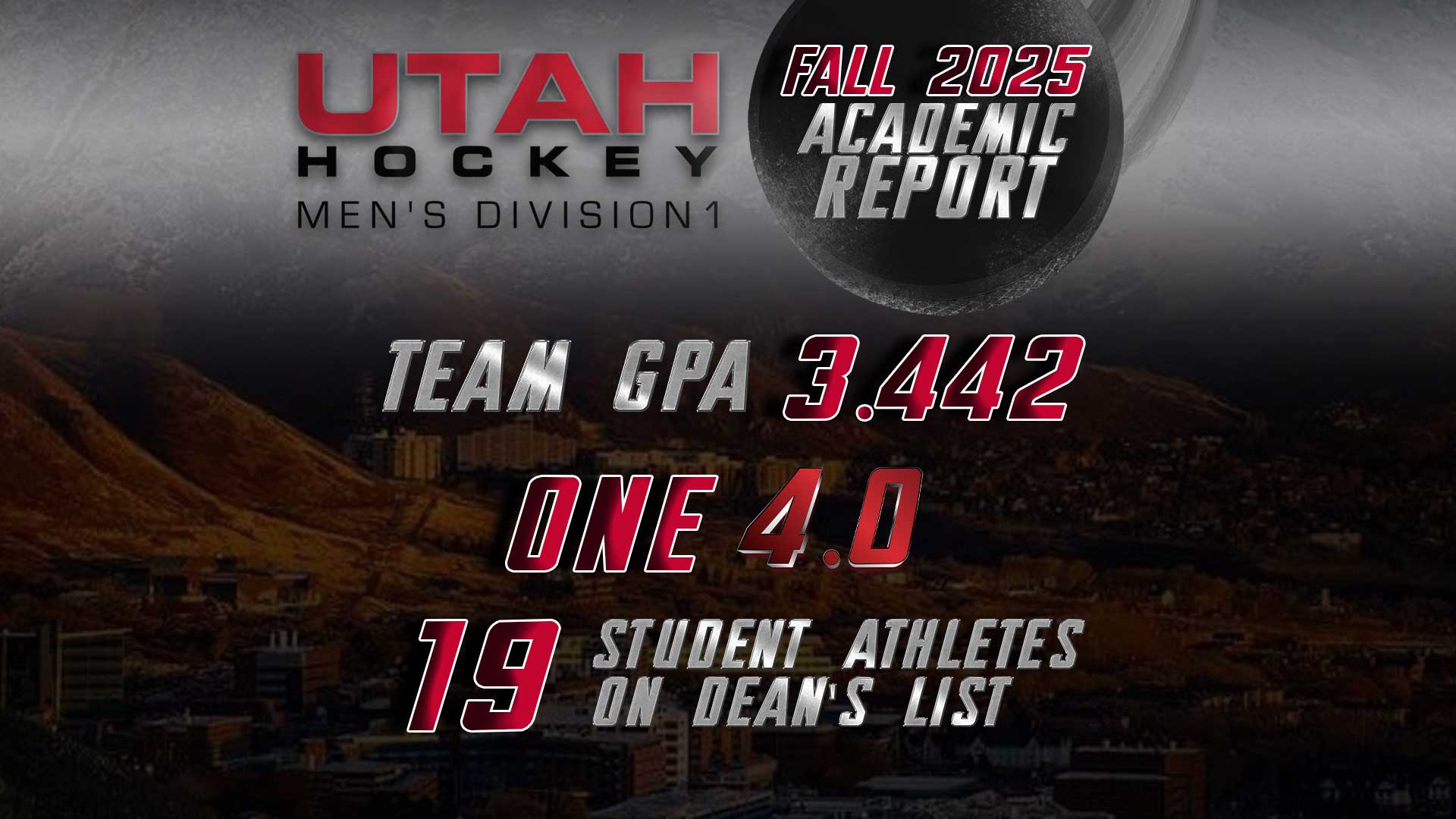 The University of Utah Men’s Division 1 Hockey has released its Academic Progress report for Fall of 2025.The Skatin’ Utes performed amongst the best in the American Collegiate Hockey Association with a team term grade point average of 3.442 and 19 student-athletes, 63% of the team, on the Dean’s List with a GPA of 3.5 or higher.
